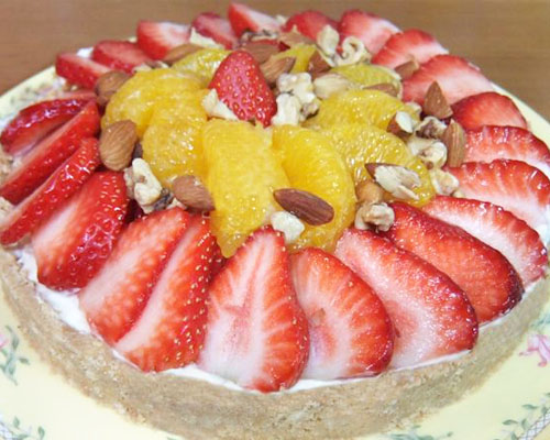 上に、イチゴと柑橘類を飾って木の実を散らし冷蔵庫で固めます。