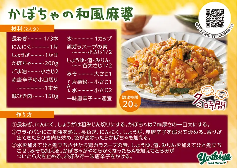 かぼちゃと根菜の味噌汁 かぼちゃのお汁粉 かぼちゃとウインナーのグラタン かぼちゃの和風麻婆 ぶりとかぼちゃの酢照り焼き ほうとう風味味噌煮込みうどん ブランデーケーキの大人トライフル りんごと紅茶の天板ケーキ マカロニピザスティック チキンと野菜のトマトチーズ焼き むきエビとブロッコリーのサラダ たたきまぐろのミニケーキ寿司 チンゲン菜の中華クリーム煮 きのことカニカマのあんかけ豆腐 魯肉飯(ルーローハン) 牛肉とレタスのあんかけチャーハン メカジキとカシューナッツの中華炒め いかとふわふわ卵のチリソース