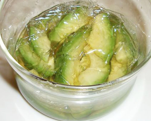 アボカドが酢につかるようにし、空気に触れないように直にラップをし、更にフタやラップをして冷蔵庫で保存します。