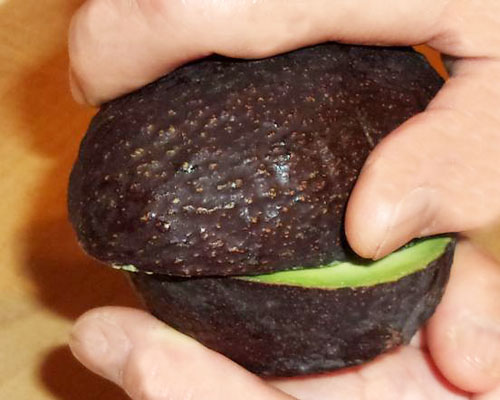 1周したら、切れ目を入れたアボカドの上下を手で持ち、ぐっと回すと半分になります。