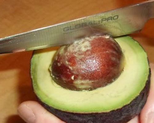 種が残っている方は、種を上に手で持ち、種に軽く包丁を当て、刃先がちょっとくいこんだら包丁をぐっと回すと種が取れます。