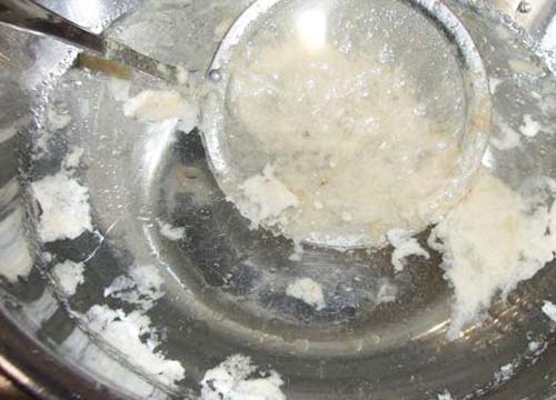 強火でしばらくアクを取りながら、煮ます。しばらくたつと、アクの量が減るので、網で取り、アクのついた網を水を入れたボウルに入れると、アク取りが楽です。