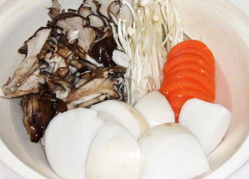 野菜が柔らかくなり、火が通るまでフタをして煮ます。土鍋の大きさにより、水・塩の量は加減して下さい。かぶの葉・せり・水菜等、すぐに火の通る青菜は別にしておきます。沸騰したら火をやや弱めフタを少しずらし吹きこぼれないようにします。 - 肉を重ならないように鍋に入れ、フタをして煮ます。