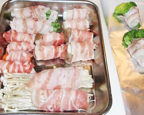 - お好みの野菜を豚肉にのせ、野菜を包むように巻いていきます。