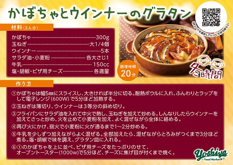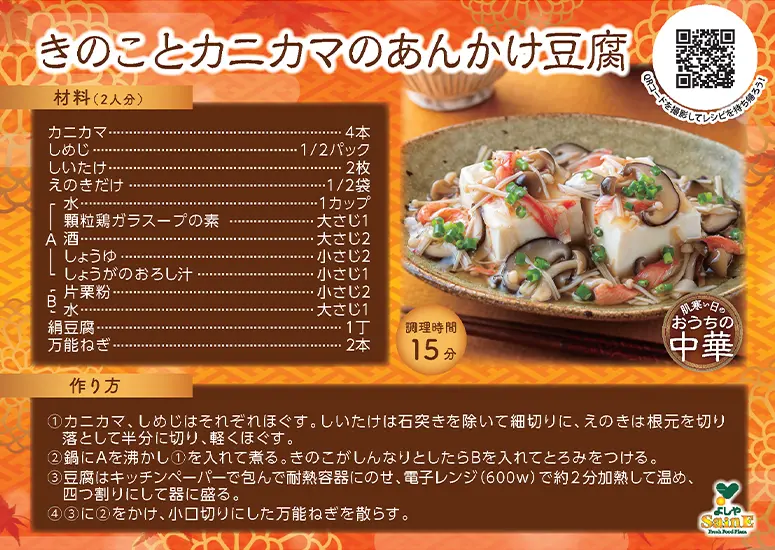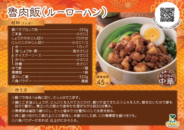 かぼちゃと根菜の味噌汁 かぼちゃのお汁粉 かぼちゃとウインナーのグラタン かぼちゃの和風麻婆 ぶりとかぼちゃの酢照り焼き ほうとう風味味噌煮込みうどん ブランデーケーキの大人トライフル りんごと紅茶の天板ケーキ マカロニピザスティック チキンと野菜のトマトチーズ焼き むきエビとブロッコリーのサラダ たたきまぐろのミニケーキ寿司 チンゲン菜の中華クリーム煮 きのことカニカマのあんかけ豆腐 魯肉飯(ルーローハン) 牛肉とレタスのあんかけチャーハン メカジキとカシューナッツの中華炒め いかとふわふわ卵のチリソース