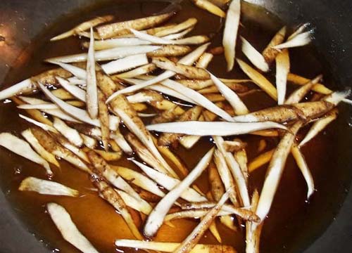 出来上がりが黒くなっても見た目を気にしない場合は、アク抜きせずにお使い下さい。 - 鍋か深めのフライパンにゴボウと麺つゆを入れ、強火にかけます。