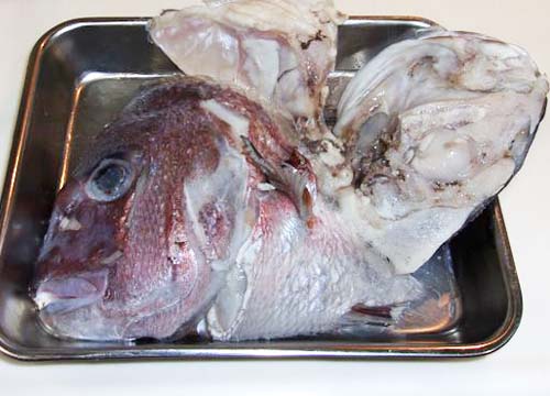 - 鯛の頭は左右に半分に切ります。