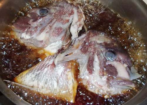 | →頭を左右に割って、かぶと煮に。 |