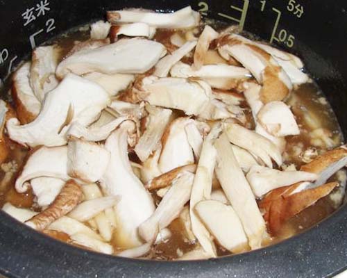 その上にきのこをのせ、普通に炊きます。①をのせたら、肉をほぐすような感じで、混ぜます。