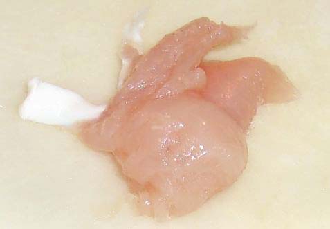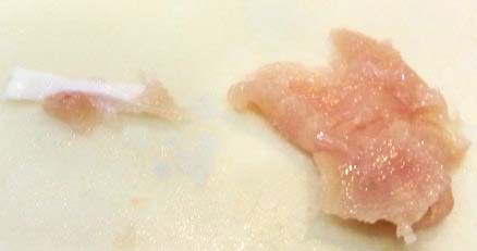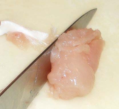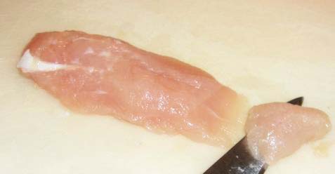 | ささみの厚さの半分くらいまで肉の真ん中を切ります。 | 切ったところから左右に開きます。完全に切らず両端は残します。 | 左右に開くと薄い1枚の肉になります。 |