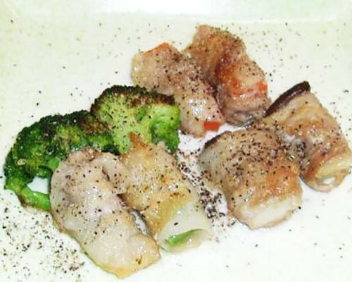 - お好みの野菜を豚肉にのせ、野菜を包むように巻いていきます。