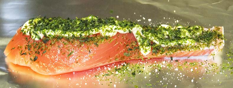 その場合は、マヨネーズのチューブが鮭に接触しないようお気を付け下さい。 - マヨネーズの上に、青海苔を振ります。