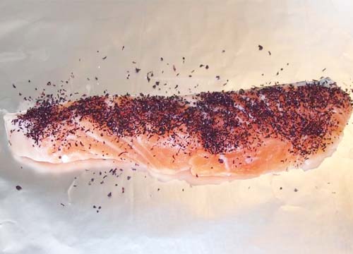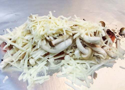 - アルミホイルを25cm程に切り、アルミホイルの真ん中に鮭を1切れ置きます。